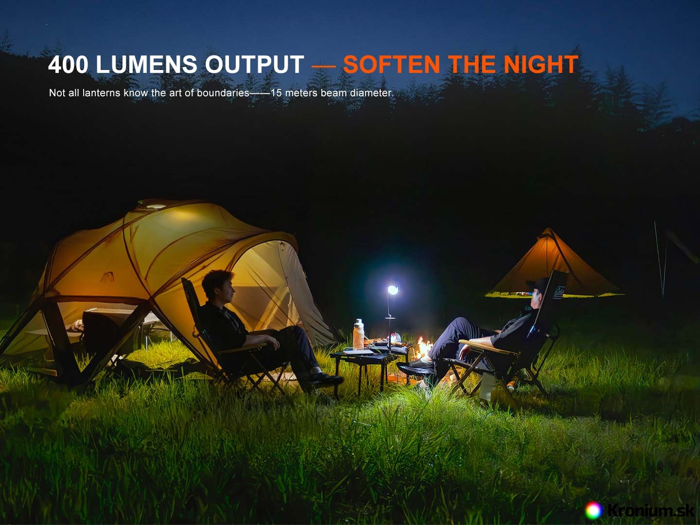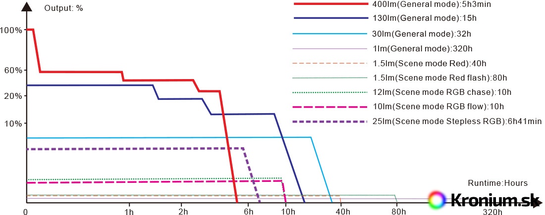 - Štyri režimy výkonu: 400 lúmenov (5 hodín) -> 130 lúmenov (15 hodín) -> 30 lúmenov (32 hodín) -> 1 lúmen (320 hodín).