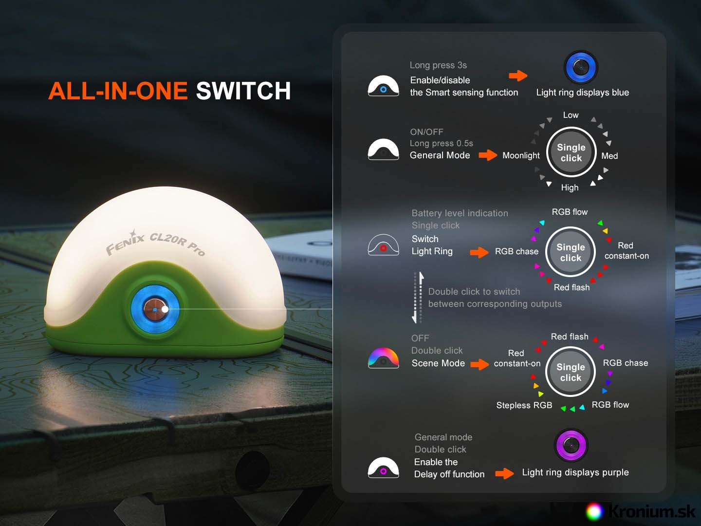 Zapnutie/vypnutie a prepínanie režimov výkonu - Lucerna sa zapne do bieleho svetla podržaním spínača po dobu 0,5 sekundy, pre zapnutie farebných režimov spínač dvakrát rýchlo stlačte. Pre zapnutie svetelného prstenca stlačte raz spínač a potom znovu v priebehu 3 sekúnd. Jednotlivé režimy svietenia zvoleného spôsobu svietenia sa prepínajú stlačením spínača. Lucerna sa vypne podržaním spínača po dobu 0,5 sekundy.