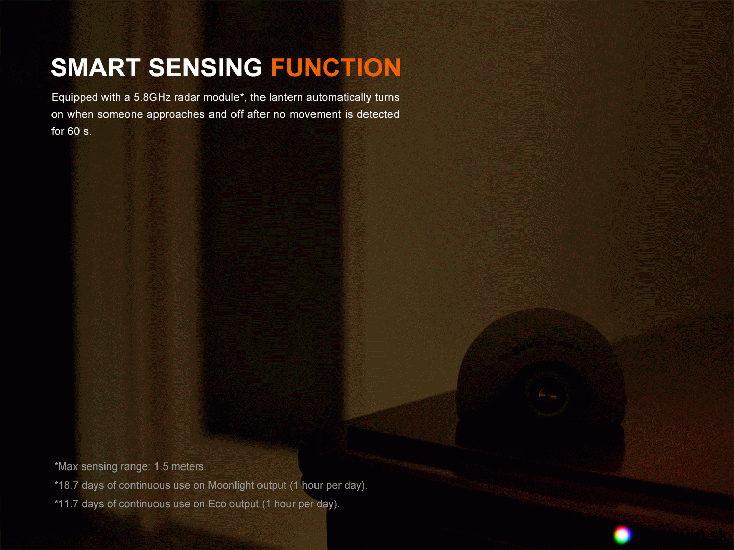 Inteligentný senzor pohybu - Ak je lucerna zapnutá do bieleho svetla a inteligentný senzor pohybu je aktívny, tak sa automaticky rozsvieti pri detekcii pohybu v dosahu 1,5 metra. Po 60 sekundách bez pohybu sa sama vypne.
