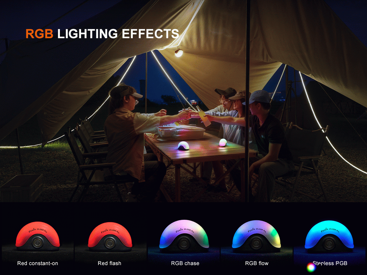 - Päť režimov červeného a RGB svetla: RGB s plynulou voľbou odtieňa 25 lúmenov (6,7 hodiny) -> RGB prebiehanie 12 lúmenov (10 hodín) -> RGB prelievanie 10 lúmenov (10 hodín) -> červené svetlo 1,5 lúmenu (40 hodín) -> červené blikanie 1,5 lúmenu (80 hodín).