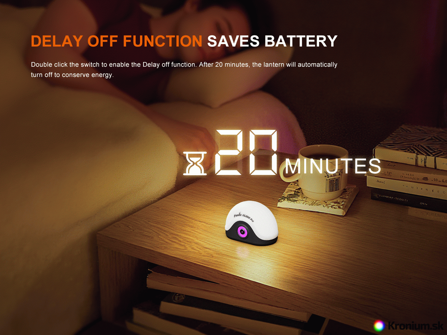 Prepínanie spôsobov svietenia - Funkcia odloženého vypnutia: Ak je lucerna zapnutá do režimov bieleho svetla, dvakrát rýchlo stlačte spínač, tým sa aktivuje funkcia odloženého vypnutia. Svetelný prstenec spínača sa rozsvieti na fialovo a lucerna sa po 20 minútach sama vypne. Ak je lucerna zapnutá do farebných režimov svietenia alebo má aktívny farebný prstenec, tak medzi týmito dvoma spôsobmi svietenia sa prepína dvojitým stlačením spínača. Ak je aktívny režim plynulej zmeny farieb, potom dvojitým stlačením spínača pozastavíte aktuálnu farbu alebo opäť obnovíte plynulú zmenu farieb.
