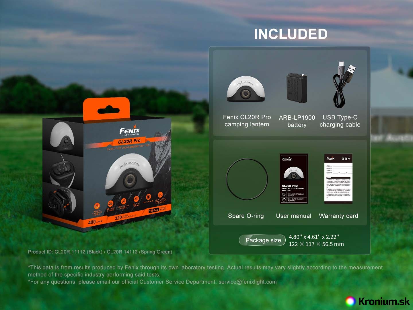 - K lampe je priložený nabíjací USB-C kábel, akumulátor Fenix ARB-LP1900, a náhradný o-krúžok.