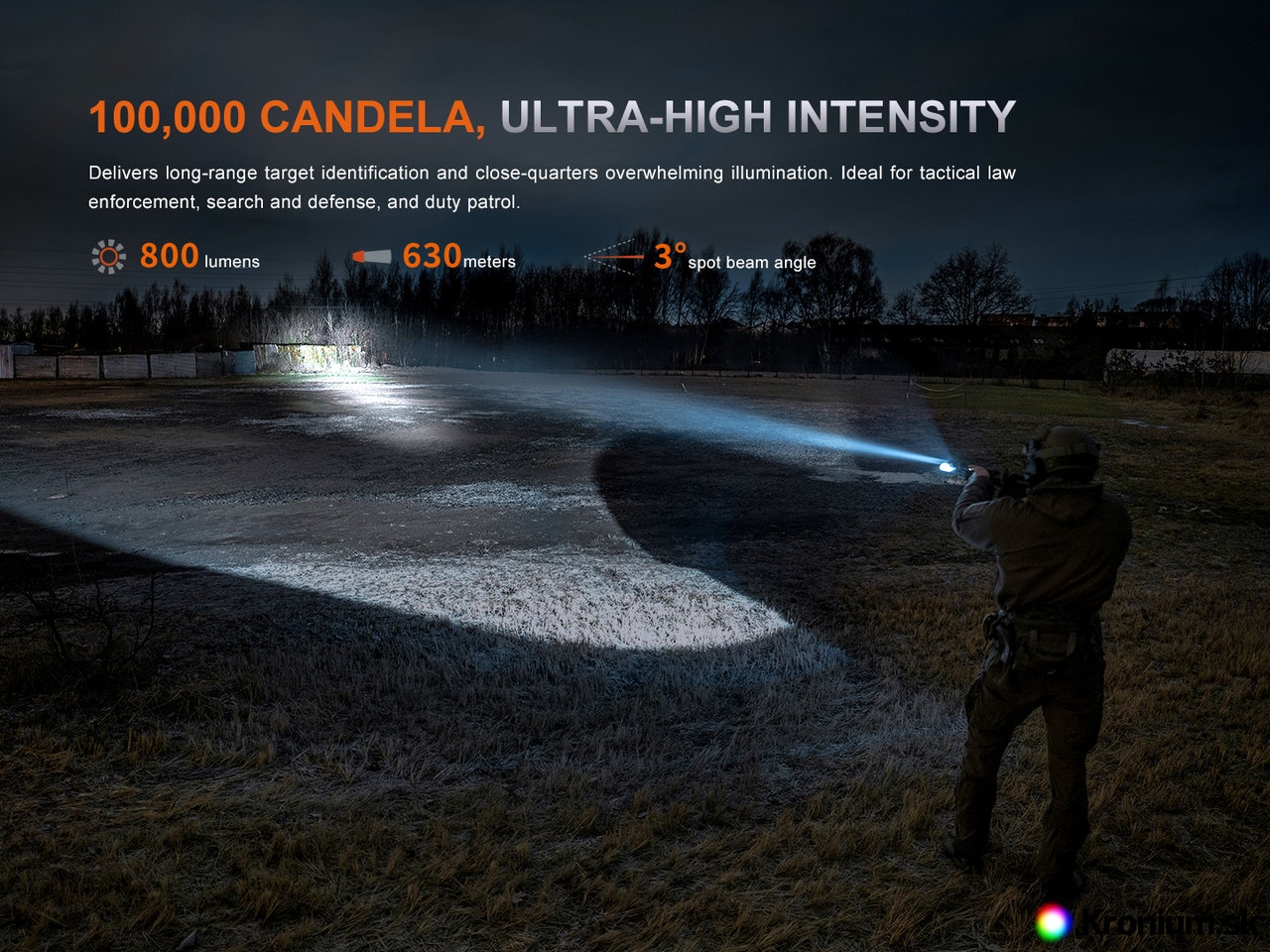- 800 lúmenov (135 minút s pribaleným akumulátorom, 70 minút s CR123A batériami).