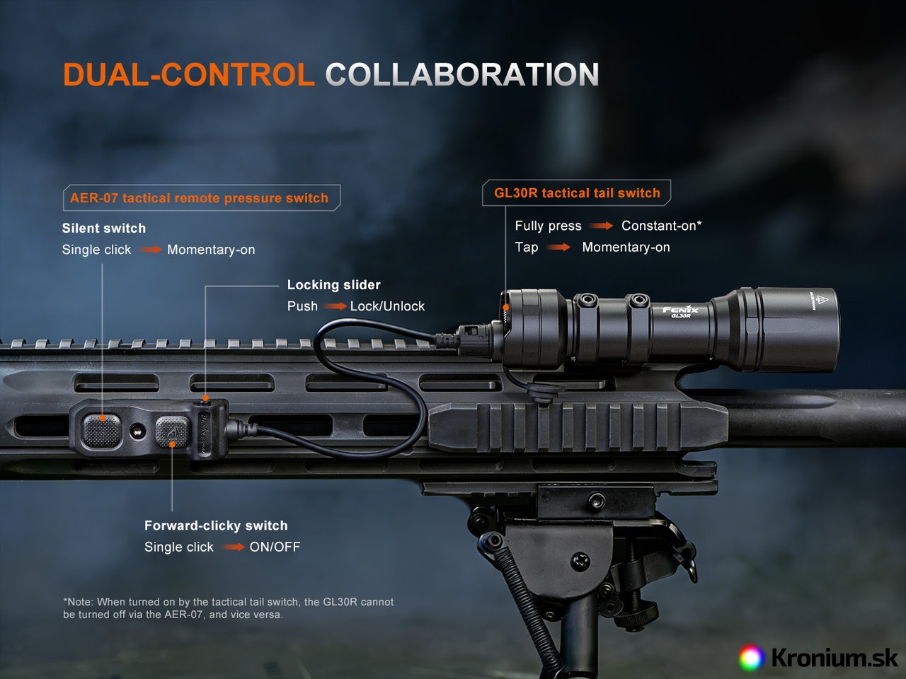 Svietidlo je možné ovládať buď jeho taktickým zadným spínačom na tele, alebo priloženým diaľkovým tlakovým spínačom AER-07. Poznámka: Ak svietidlo zapnete jedným zo spínačov, nie je možné ho vypnúť tým druhým.
