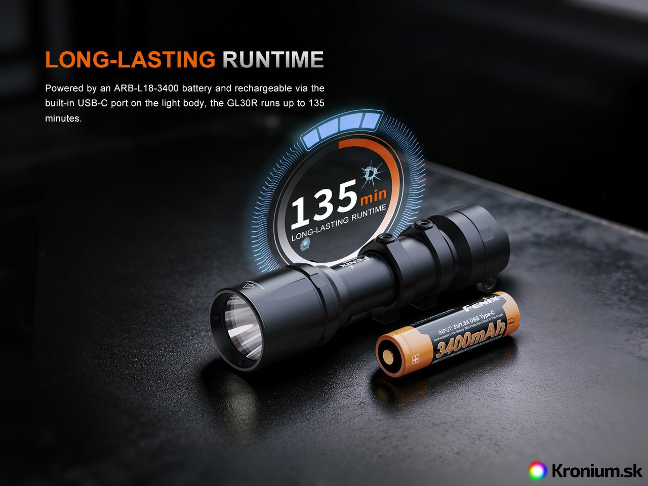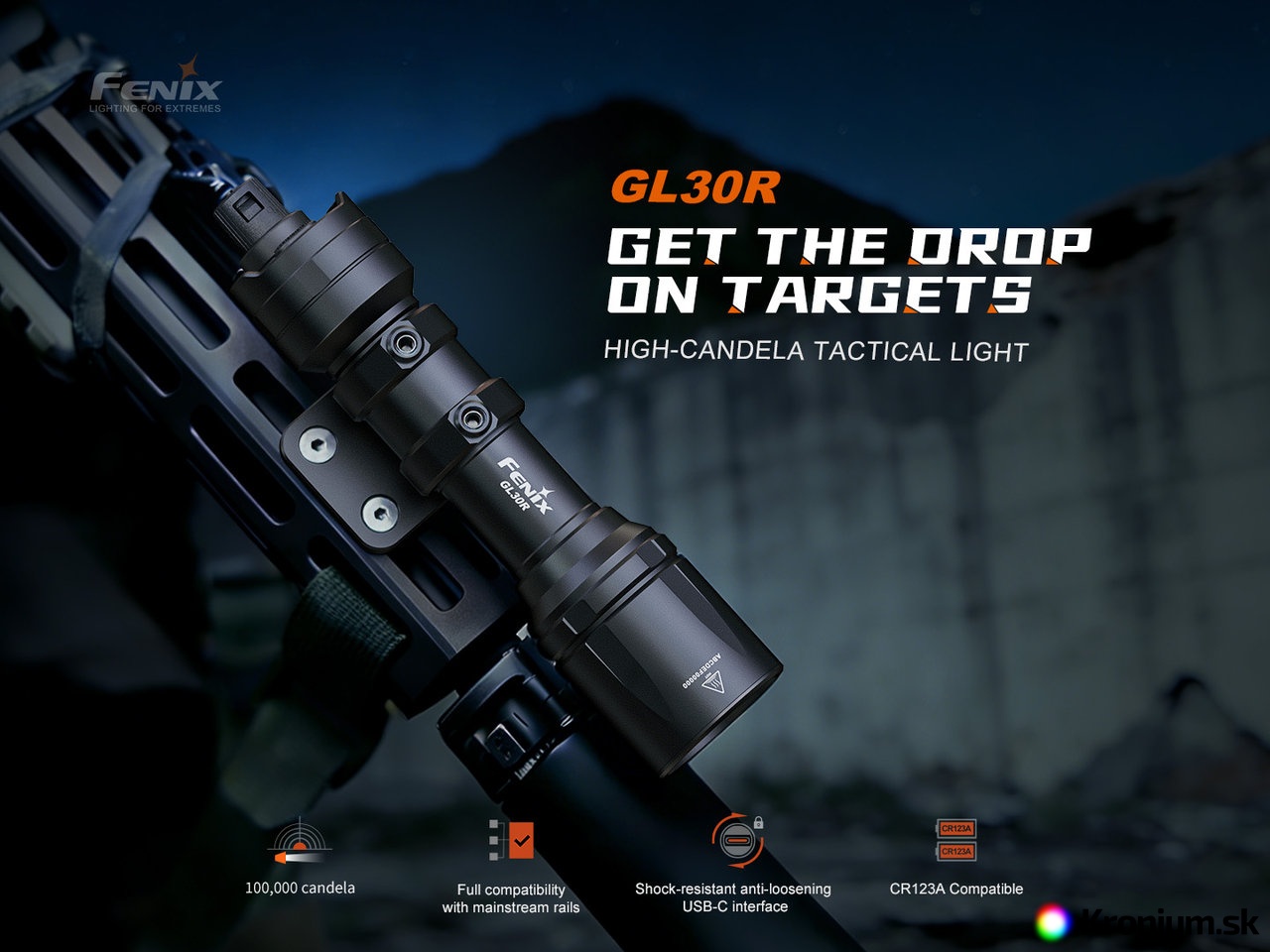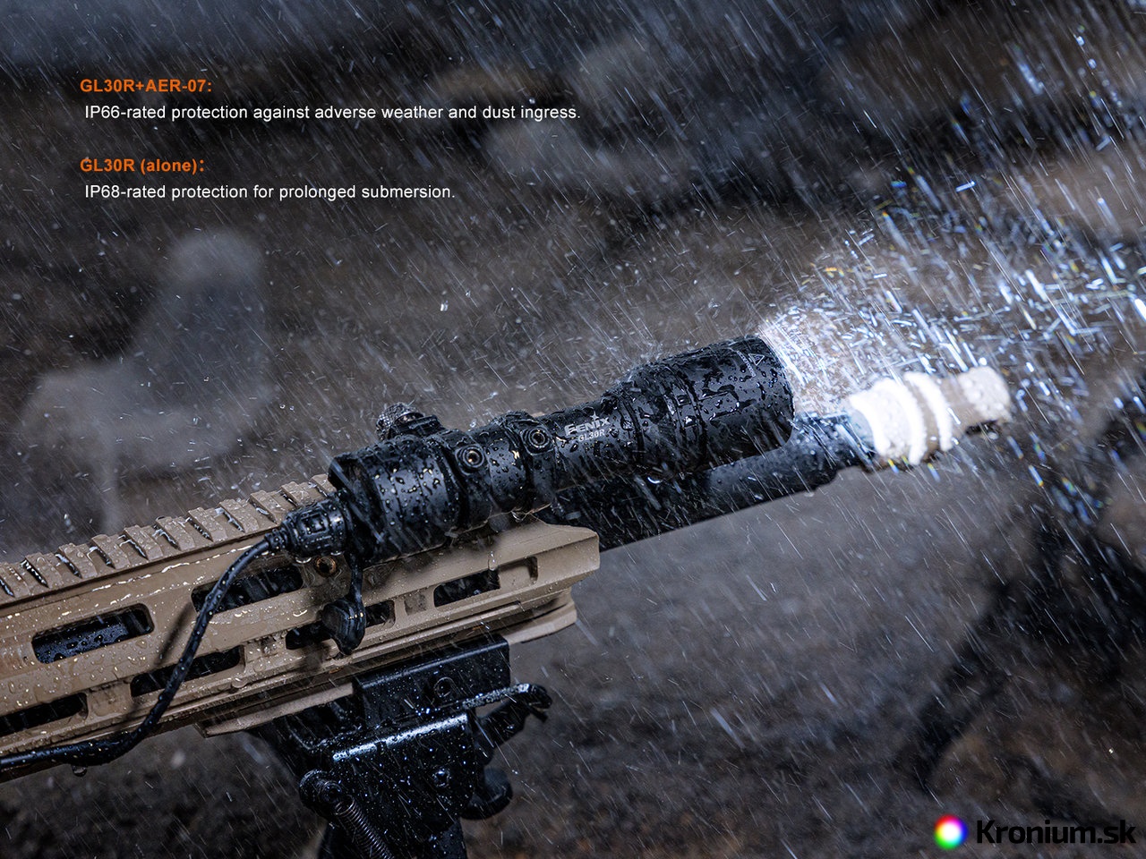 Taktické nabíjacie LED svietidlo Fenix GL30R je skonštruované špeciálne pre použitie na dlhých zbraniach. Ponúka špičkový svetelný výkon 800 ANSI lúmenov s extrémnym dosvitom až 630 metrov. Svietidlo je napájané jedným Li-ion akumulátorom typu 18650 s kapacitou 3400 mAh, ktorý sa nabíja priamo v svietidle cez multifunkčný USB-C port a je súčasťou balenia. Alternatívne je možné použiť aj dve jednorazové lítiové batérie CR123A. Ovládanie svietidla je riešené taktickým zadným spínačom alebo pribaleným diaľkovým káblovým spínačom AER-07. Ten sa zapája do USB-C portu a ponúka uzamykací posuvník proti nechcenej aktivácii. Montáž na zbraň je vysoko variabilná – svietidlo sa dodáva s montážami pre štandardnú lištu Picatinny (MIL-STD-1913) aj pre systém M-Lok, čo umožňuje flexibilnú inštaláciu v priamej (in-line) aj vyosenej (offset) pozícii. Svietidlo je tak dokonalým nástrojom pre profesionálov, ozbrojené zložky, športových strelcov, poľovníkov aj airsoft.