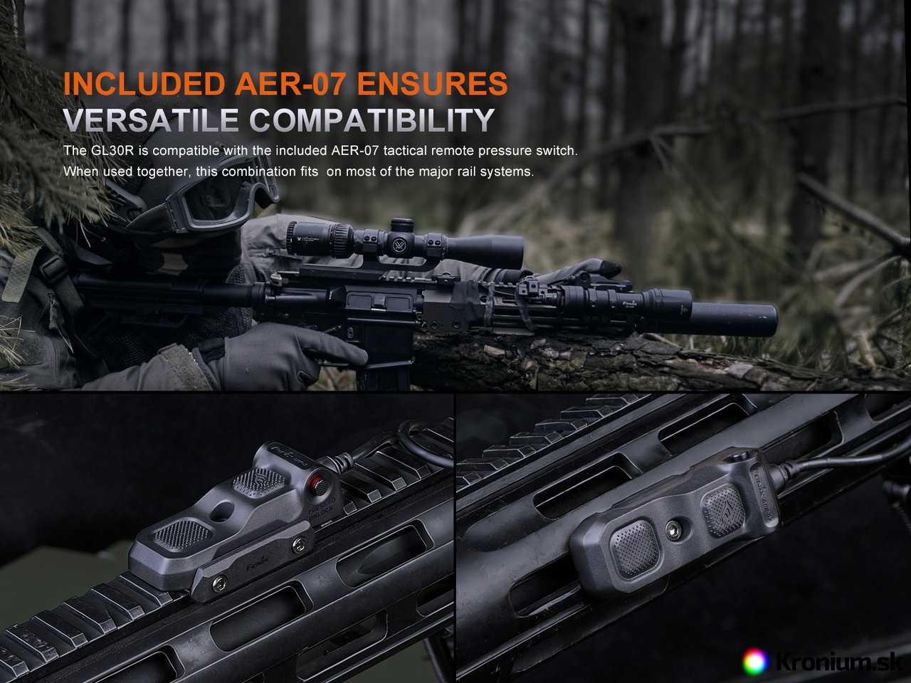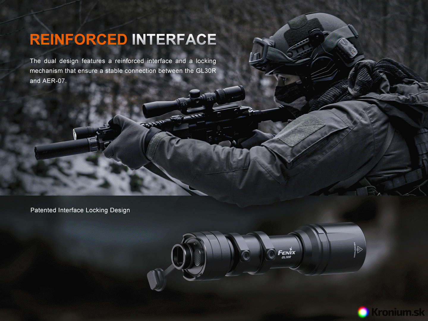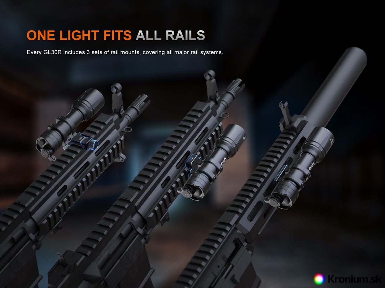 Taktické nabíjacie LED svietidlo Fenix GL30R je skonštruované špeciálne pre použitie na dlhých zbraniach. Ponúka špičkový svetelný výkon 800 ANSI lúmenov s extrémnym dosvitom až 630 metrov. Svietidlo je napájané jedným Li-ion akumulátorom typu 18650 s kapacitou 3400 mAh, ktorý sa nabíja priamo v svietidle cez multifunkčný USB-C port a je súčasťou balenia. Alternatívne je možné použiť aj dve jednorazové lítiové batérie CR123A. Ovládanie svietidla je riešené taktickým zadným spínačom alebo pribaleným diaľkovým káblovým spínačom AER-07. Ten sa zapája do USB-C portu a ponúka uzamykací posuvník proti nechcenej aktivácii. Montáž na zbraň je vysoko variabilná – svietidlo sa dodáva s montážami pre štandardnú lištu Picatinny (MIL-STD-1913) aj pre systém M-Lok, čo umožňuje flexibilnú inštaláciu v priamej (in-line) aj vyosenej (offset) pozícii. Svietidlo je tak dokonalým nástrojom pre profesionálov, ozbrojené zložky, športových strelcov, poľovníkov aj airsoft.