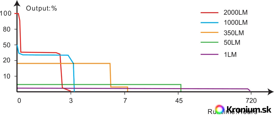 - Sedem režimov svietenia: Turbo 2000 lúmenov (2 h 50 min) – 1000 lúmenov (3 h 20 min) – 350 lúmenov (7 h 16 min) – 50 lúmenov (45 h 24 min) – 1 lúmen (720 hodín) – Stroboskop (2000 lúmenov) – SOS (50 lúmenov).