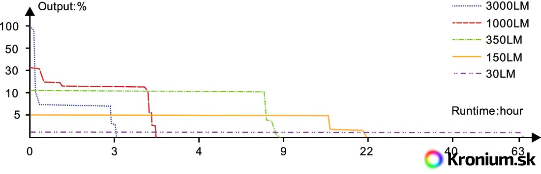 - Sedem režimov svietenia: Turbo 3000 lúmenov (3 hodiny) – 1000 lúmenov (3,45 hodiny) – 350 lúmenov (8,8 hodiny) – 150 lúmenov (21,8 hodiny) – 30 lúmenov (63,45 hodiny) – Stroboskop (3000 lúmenov) – SOS (150 lúmenov).