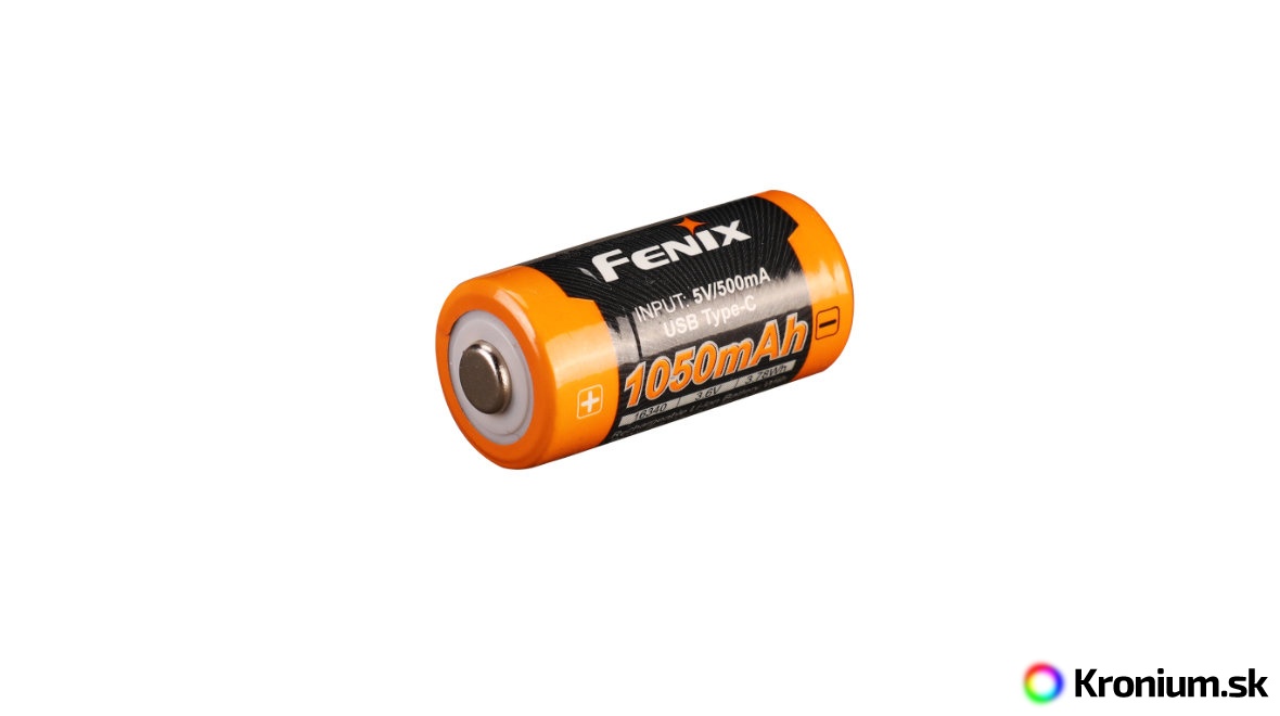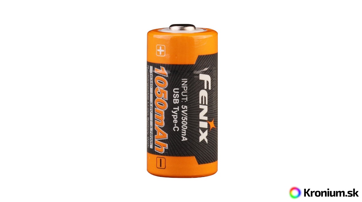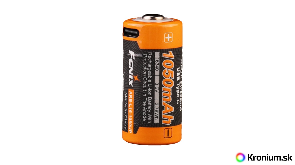 Fenix ARB-L16-1050UP je špičková nabíjacia Li-ion batéria veľkosti RCR123A (16340) s obrovskou kapacitou 1050 mAh a vlastným nabíjacím USB-C konektorom.