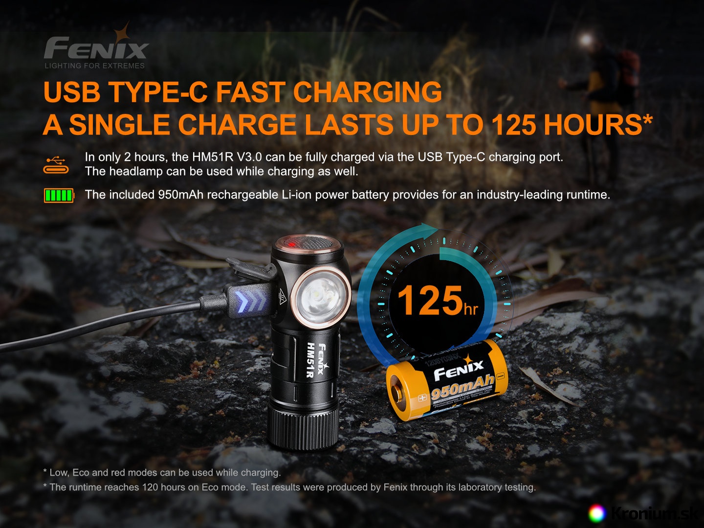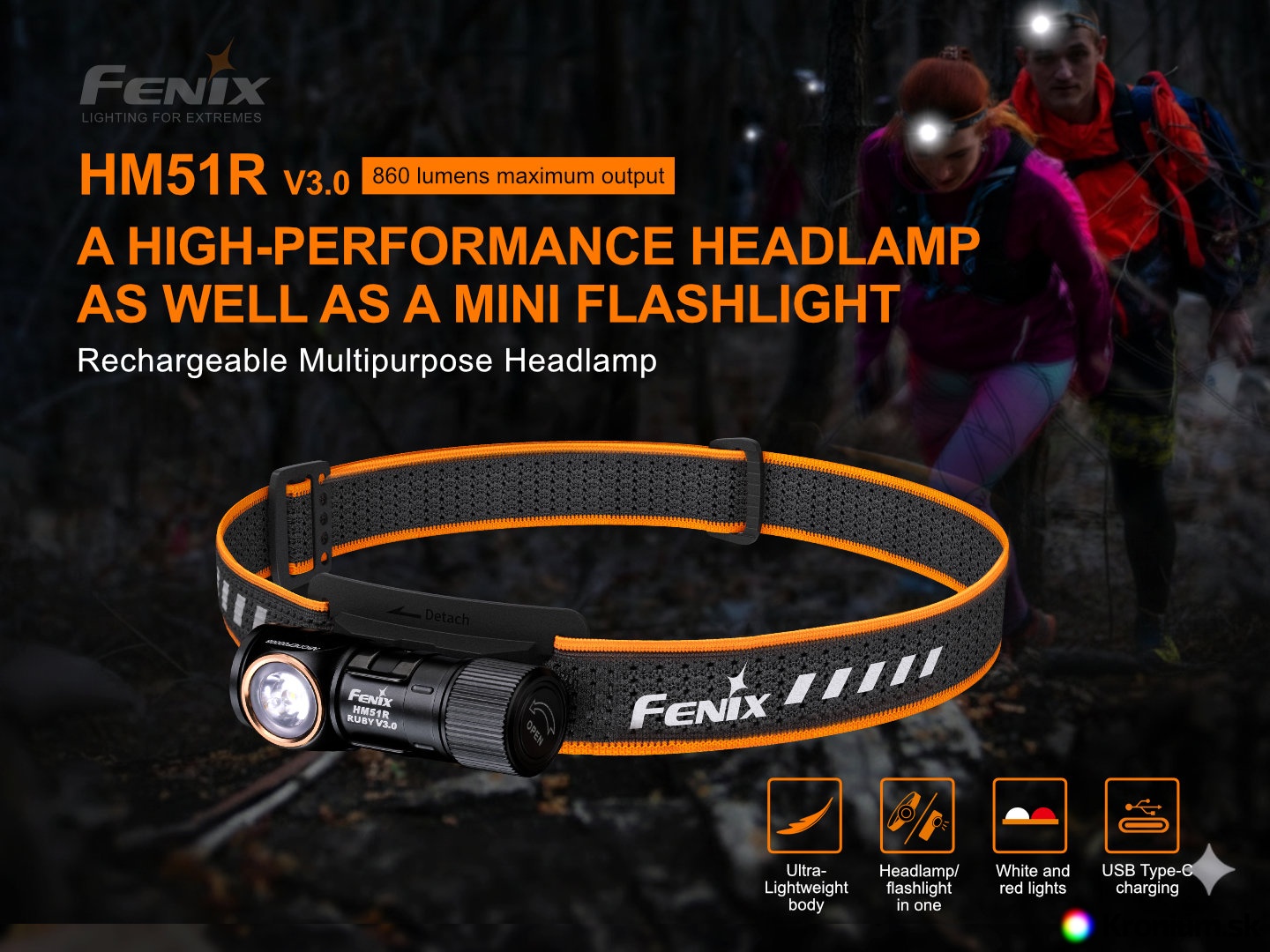 Tretia generácia veľmi obľúbenej nabíjateľnej čelovky Fenix HM51R Ruby V3.0 ponúka svetelný tok až 860 lúmenov (ANSI) neutrálneho bieleho svetla (4500 K) s dosvitom až 140 metrov a navyše je vybavená aj červenými LED. Napája ju jeden nabíjací akumulátor typu RCR123A (je súčasťou balenia), ktorý sa dobíja priamo v svietidle cez moderný USB-C konektor, alternatívne možno na napájanie použiť aj jednorazovú lítiovú batériu CR123A (s obmedzeným max. výkonom na 150 lúmenov). V ovládacom tlačidle je navyše indikačná LED, vďaka ktorej budete vždy vedieť, kedy dobiť akumulátor. Koncovka svietidla je magnetická, takže ju možno ľahko uchytiť na čokoľvek železné. HM51R disponuje deviatimi rôznymi režimami osvetlenia, ktoré umožnia voliť medzi vysokým výkonom a dlhou výdržou (až 125 hodín). Svietidlo je napájané digitálne kontrolovaným konštantným prúdom pre zaručenie stáleho svetelného výkonu aj pri znižovaní napätia v batériách (pri ich pozvoľnom vybíjaní).