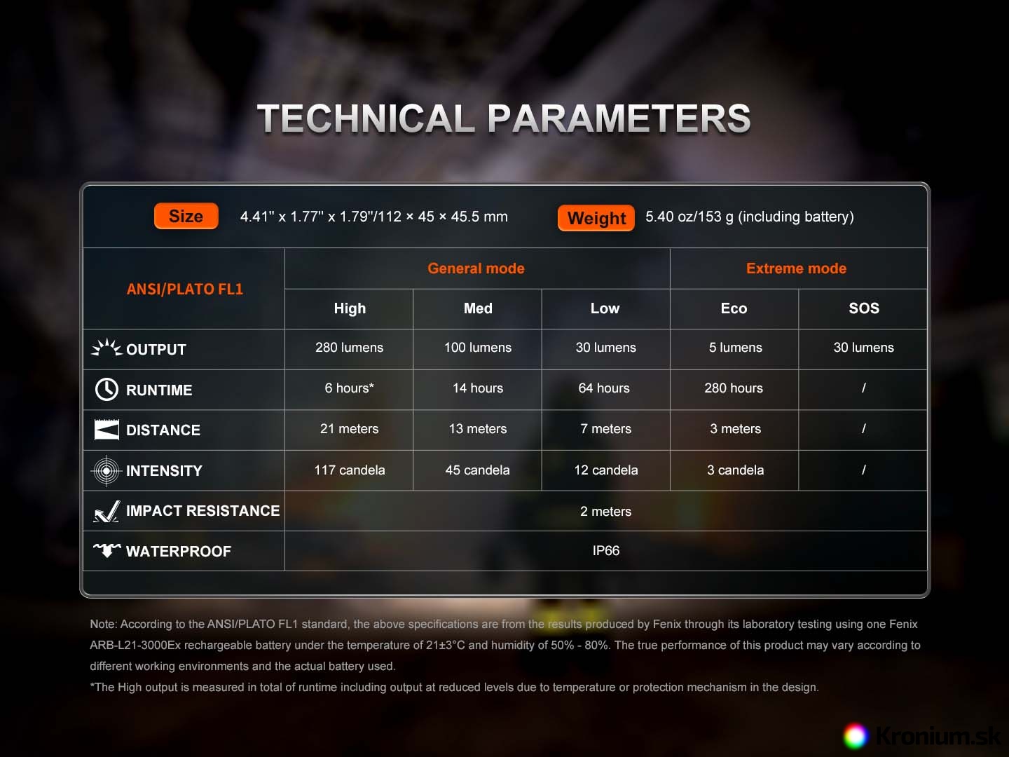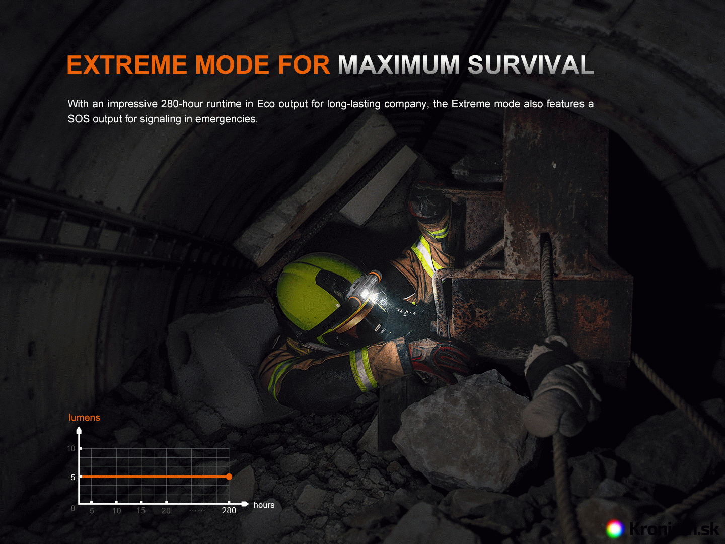 - Päť režimov bieleho svetla: 280 lúmenov (6 hodín) -> 100 lúmenov (14 hodín) -> 30 lúmenov (64 hodín) -> 5 lúmenov (280 hodín) -> SOS 30 lúmenov.