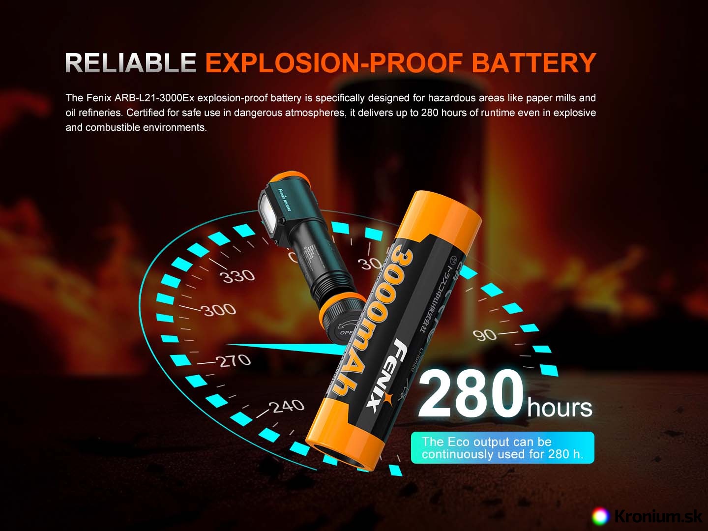 - Používa špeciálny Li-ion akumulátor Fenix ARB-L21-3000Ex s kapacitou 3000 mAh. Jedná sa o upravený typ certifikovaný pre výbušné prostredia.