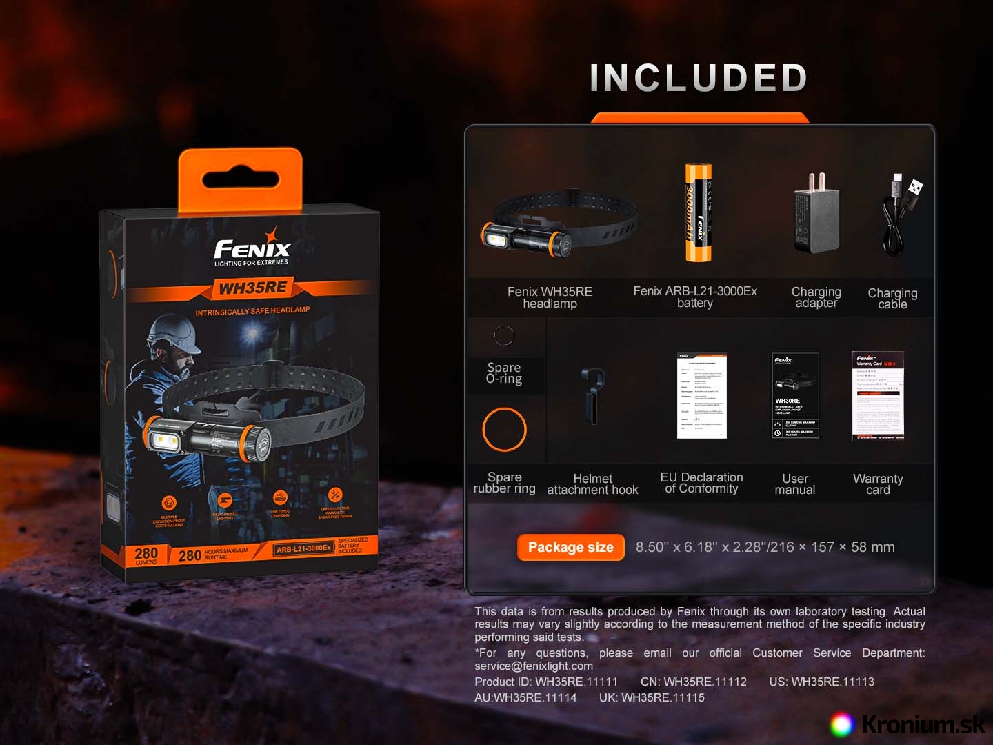 - Čelovka Fenix WH35RE, batéria Fenix ARB-L21-3200Ex, nabíjací USB adaptér, nabíjací USB-C kábel, EÚ Vyhlásenie o zhode, náhradný O-krúžok, náhradný gumový krúžok, háčik pre uchytenie na prilbu, antistatický gumový popruh na hlavu, posuvná pracka, návod na použitie, záručný list.
