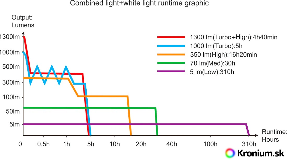 - 1000 lúmenov (5 hodín) -> 350 lúmenov (16,3 hodiny) -> 70 lúmenov (30 hodín) -> 5 lúmenov (310 hodín)