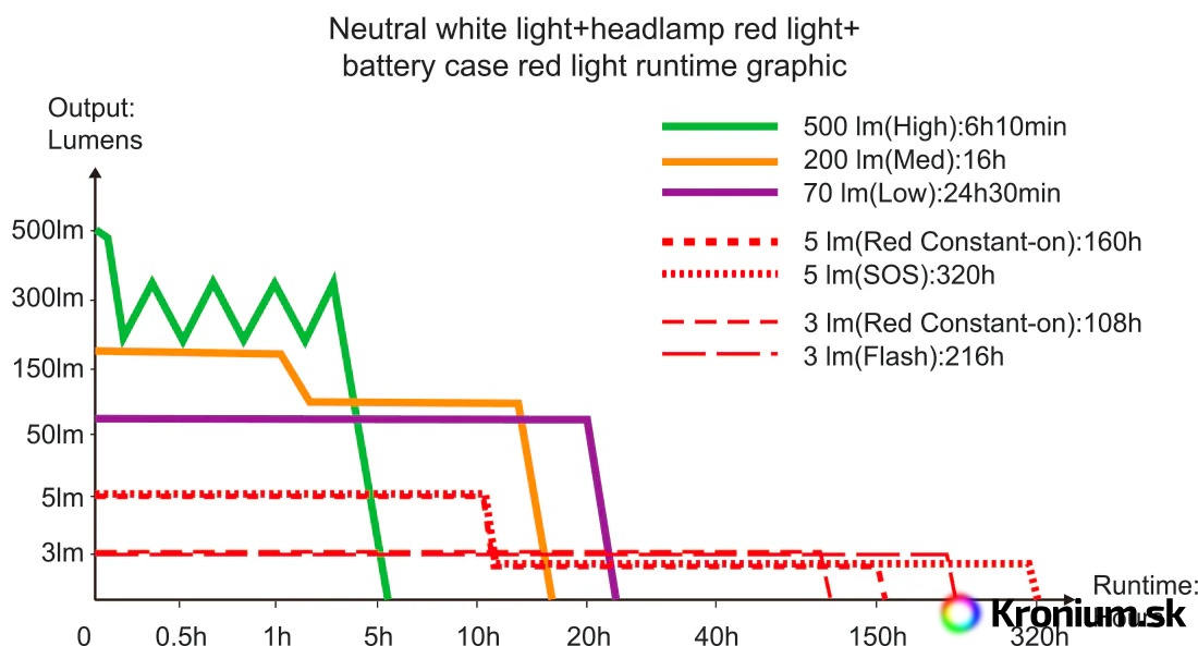 - 500 lúmenov (6,16 hodiny) -> 200 lúmenov (16 hodín) -> 70 lúmenov (24,5 hodiny)