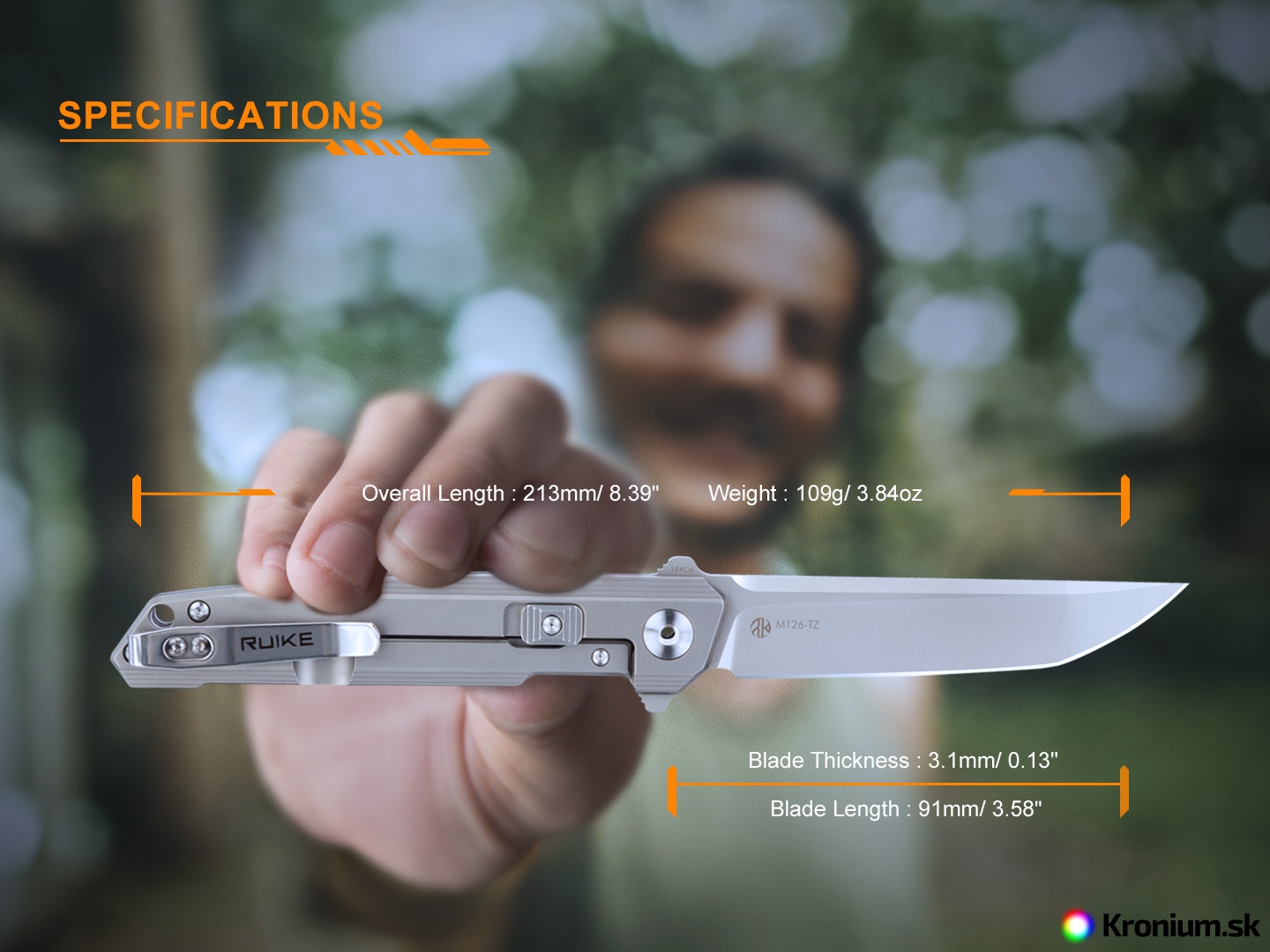 Nôž Ruike M126-TZ je vybavený čepeľou dlhou 91 mm a exkluzívnou rúčkou vyrobenou z titánovej zliatiny TC4. Nôž má páčku flipper pre rýchle a pohodlné otvorenie a proti nechcenému zatvoreniu je zabezpečený poistkou frame lock, ktorú je možné zaistiť zámkom beta lock. Nôž je vybavený sponou na uchytenie vo vrecku a je ideálny na každodenné nosenie (kategória EDC).