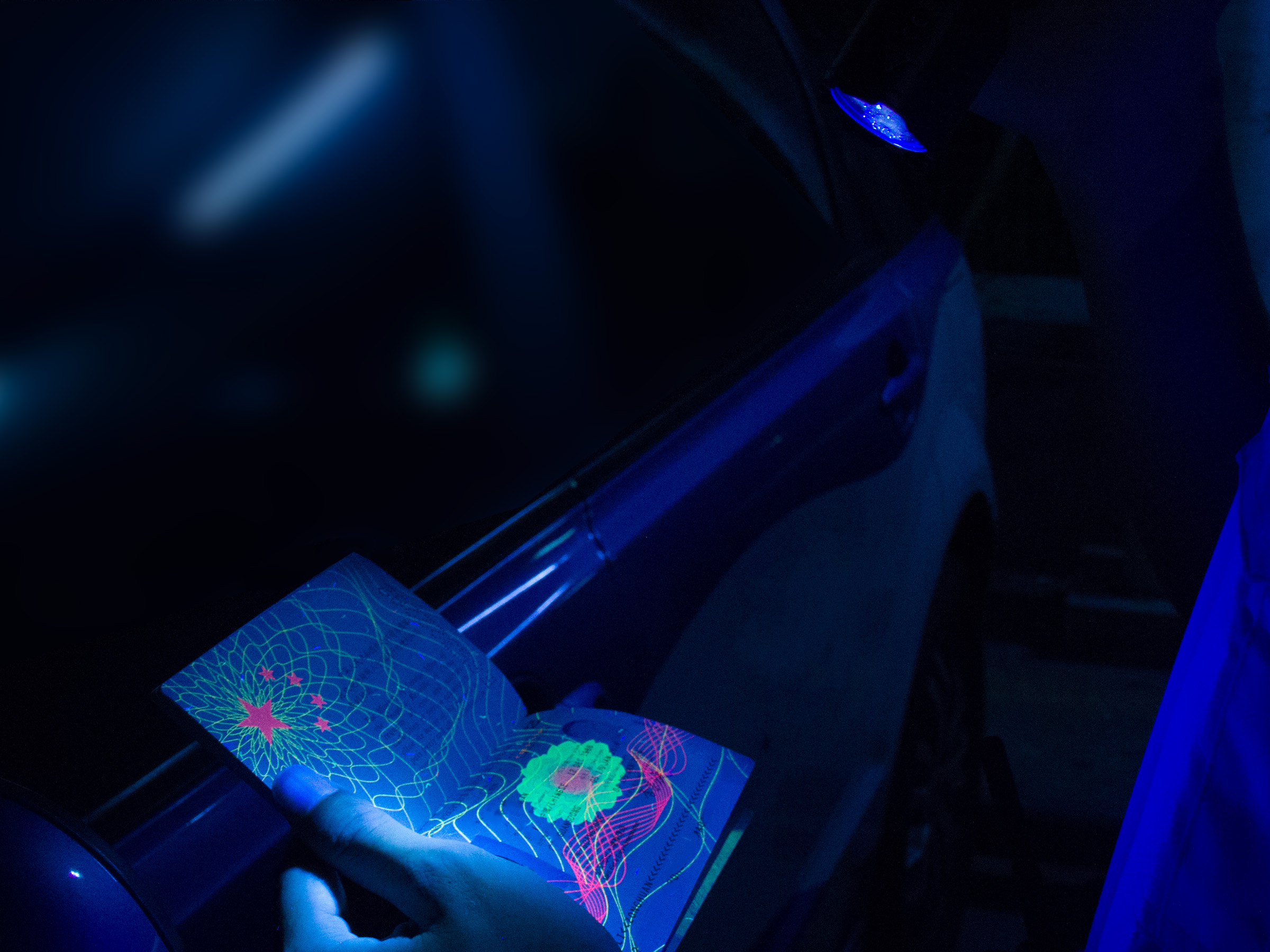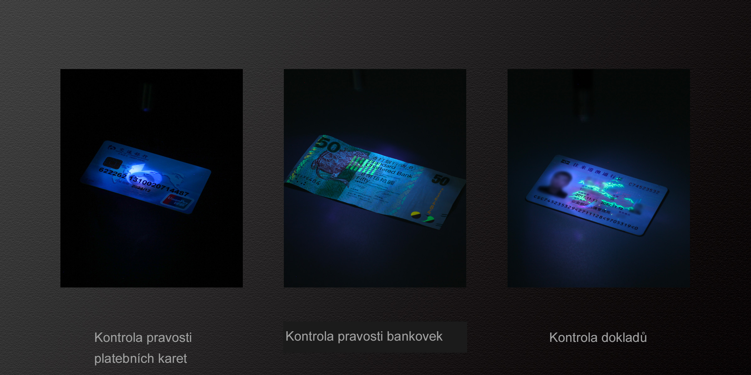 - Overovanie pravosti: Bankovky, doklady, platobné karty a iné cennosti majú ochranné prvky viditeľné najmä pod UV svetlom.