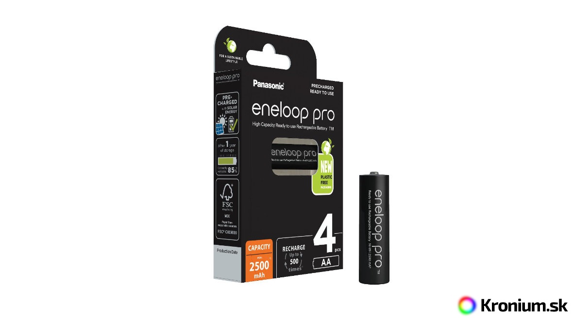 Špičkové nabíjacie tužkové NiMH batérie Panasonic Eneloop Pro (predtým Sanyo XX Eneloop) s minimálnou kapacitou 2500 mAh. Akumulátory Panasonic Eneloop Pro kombinujú výhody vysokej kapacity a technológie eneloop pre veľmi nízke samovybíjanie. Ide o víťaza testu nabíjacích AA batérií v časopise dTest 4/2020.