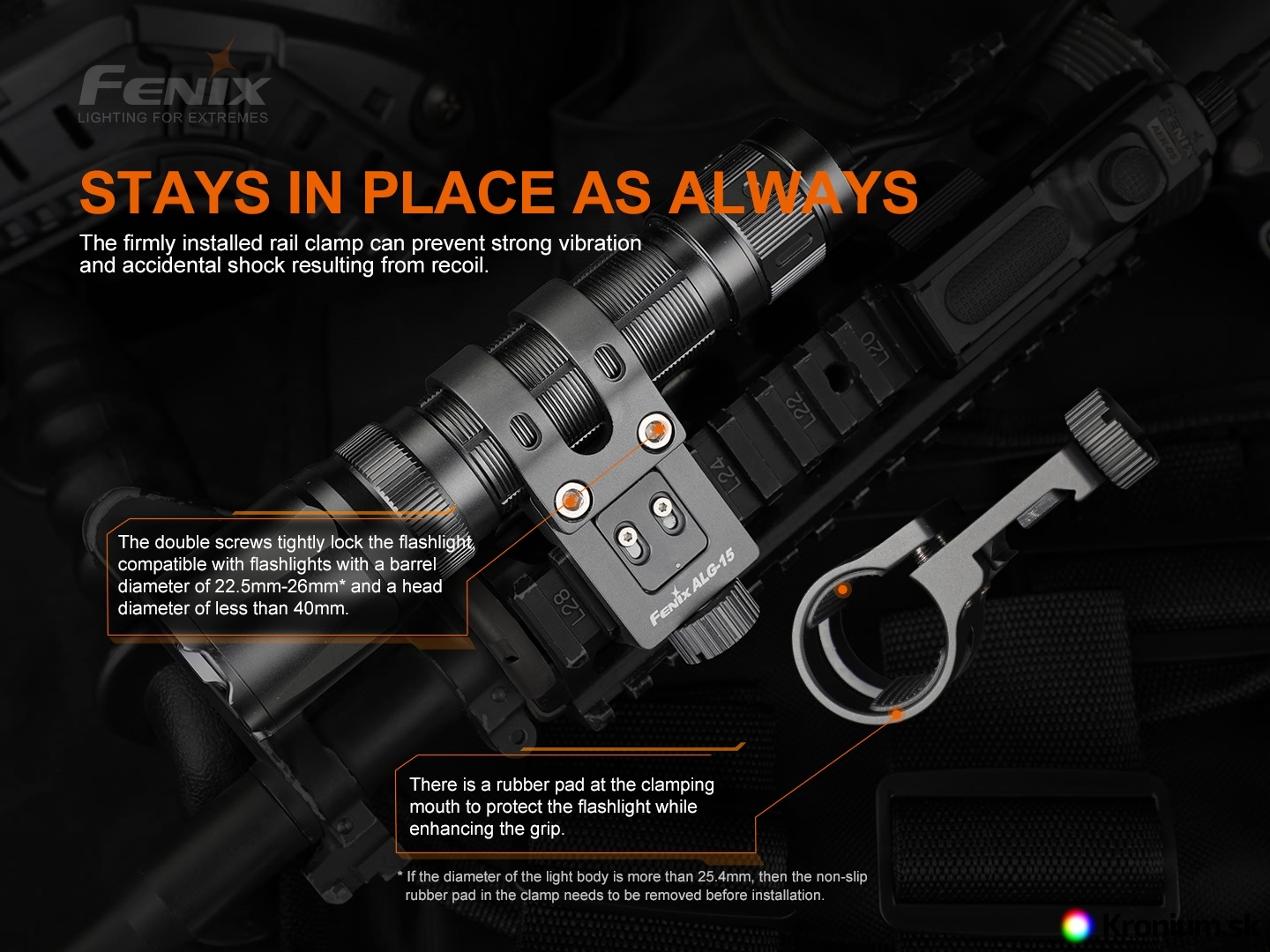 Rýchloupínacia kovová montáž svietidla na normalizovanú zbraňovú lištu (Weaver / Picatinny / MIL-STD-1913). Vhodné pre svietidlá s priemerom tela 22,5 - 26,0 mm a priemerom hlavy do 40 mm. Vhodná napríklad pre svietidlá Fenix TK09, TK11 TAC, TK15, TK16 V2.0, TK20R V2.0, TK22 UE, TK22 TAC, TK25 IR, TK25 R&B, TK25 Red, TK25 UV, TK26R, HT30R, PD32 V2.0, PD35, PD36R, PD36R PRO, PD36 TAC, UC35, FD41.